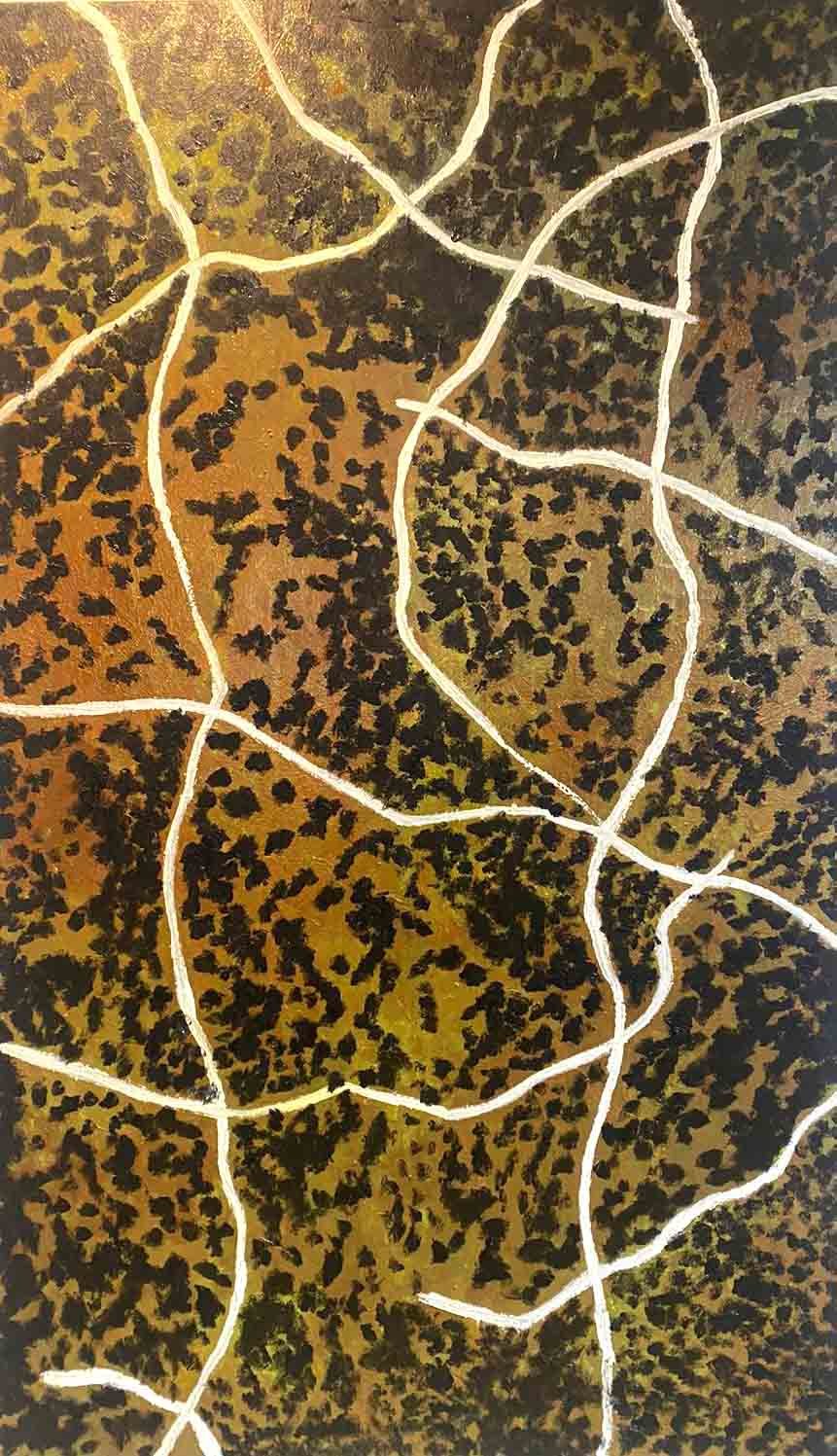 In Seeking the Origin, Aimema Úai evokes the memory of his grandparents and the path that connects his territory to ancestral knowledge. The work is part of the Caminos (íio) series, in which painting becomes a gesture of spiritual search and return to his Murui-Muina roots. From his place of origin —La Chorrera, between the Putumayo and Caquetá rivers— the Murui-Muina and other Amazonian peoples have resisted in order to preserve the jíbina or koka, the sacred plant that helps care for the world and maintain its natural balance. However, with the arrival of Catholic evangelizers after the rubber genocide, the demonization of the plant began. Decades later, during the cocaine boom, its spiritual meaning was again distorted. Despite these ruptures, within the mambeadero —a space for word, listening, and teaching— ancestral knowledge about the proper use of the plant has been preserved. Today, mambe, the fine powder resulting from mixing toasted and ground coca leaves with the ashes of yarumo —a plant and tree considered sacred by Amazonian peoples—, reaffirms itself as a symbol of strength and cultural continuity: word of life. Mambe sustains spiritual communication, collective thought, and the daily practice of the principles that guide life.