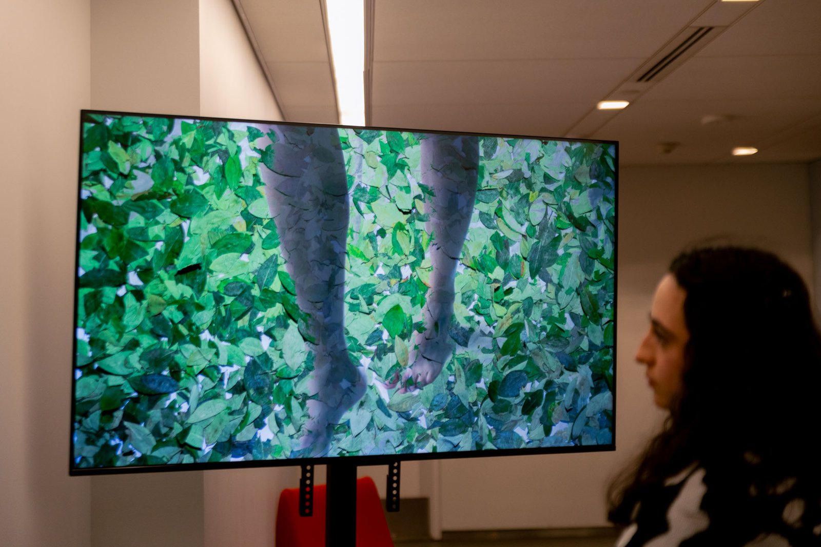 In her piece Macabre Dance, Delgado intertwines performance, sound, and installation to explore the complex historical realities of Bolivia surrounding the coca leaf. She creates a tapestry made of coca leaves, onto which she projects a video showing a woman’s feet dancing to Danse Macabre by Camille Saint-Saëns, inspired by the play Danza macàbra by Camillo Antona Traversi, a satirical Italian work from the late 19th century.