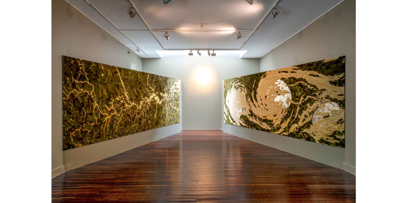 In this monumental installation, Rojas critiques the environmental degradation and social inequalities resulting from extractive industries and illicit economies. By using materials like coca leaf powder and gold leaf, Rojas underscores the complex interplay between cultural heritage and the exploitative forces of globalization.