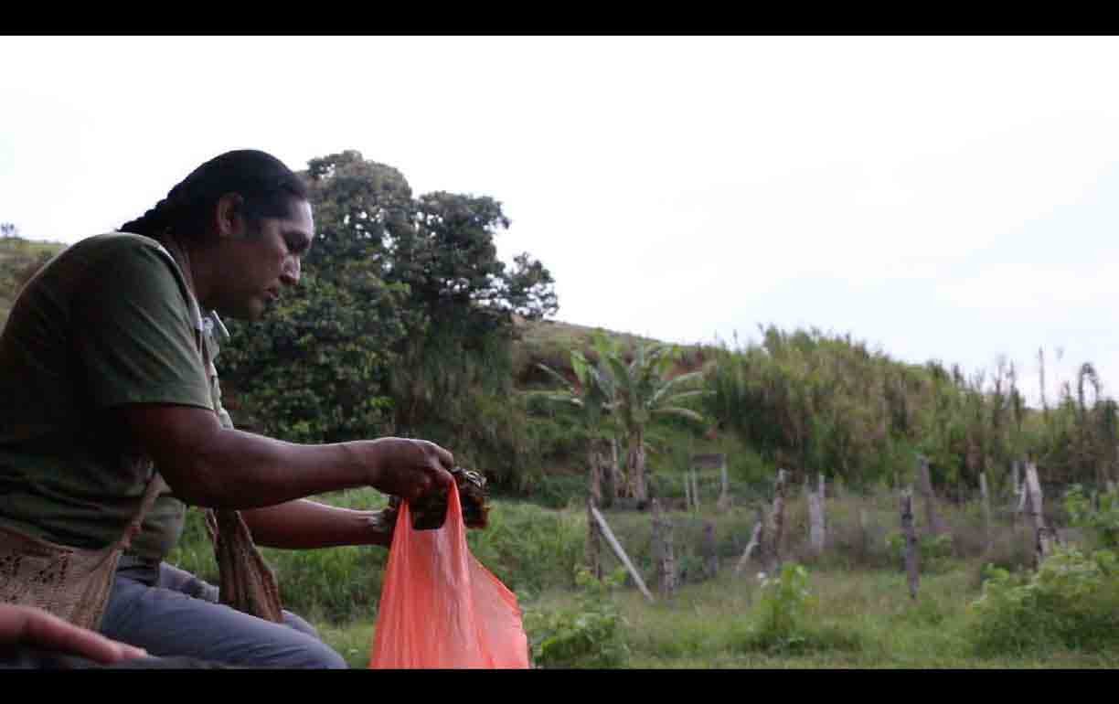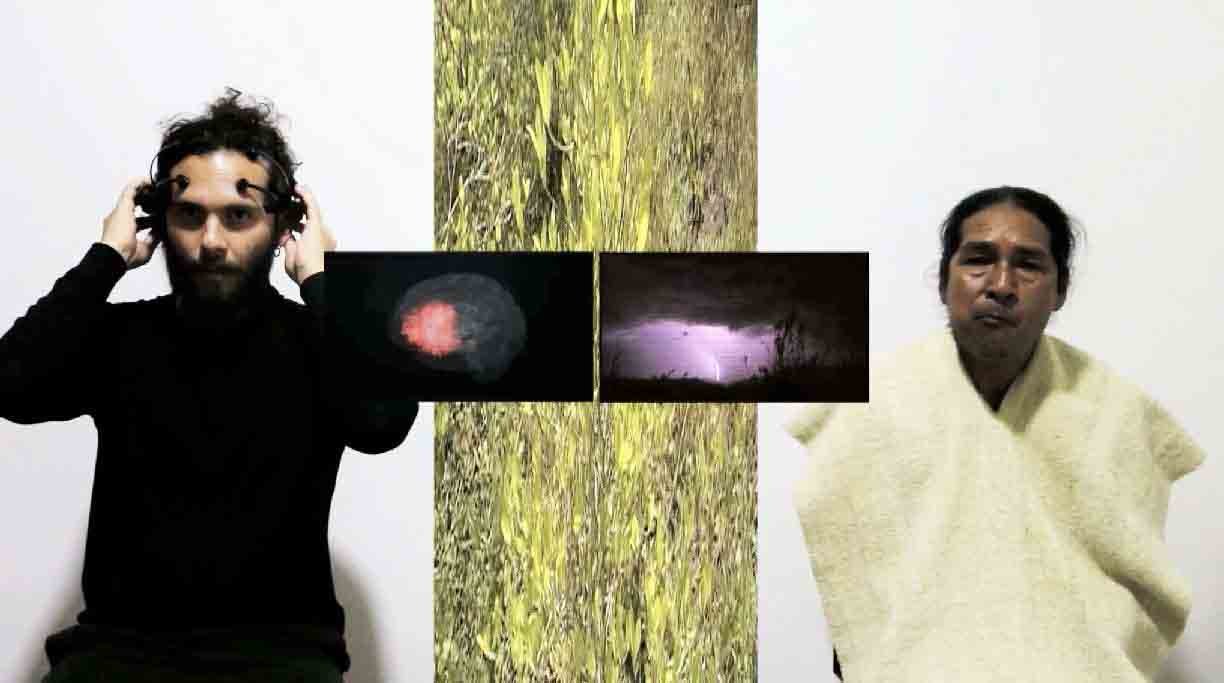 Synaptic Emancipation contrasts the narratives embedded in Western technological objects—designed to access the mysteries of the brain—with the ways in which Indigenous communities activate their own technologies by chewing coca leaves to awaken consciousness. Receiving the visions of coca through dreams opens a space of telepathic communication that does not entail the destruction of any ecosystem, unlike the production of so-called “high technology” in the West.The video features Luis Aureliano Yunda, a The’ Wala (traditional healer) from the Nasa community, who has been a close friend of the artists for over fourteen years. Their friendship has been intertwined with traditional medicine and with ceremonial, philosophical, artistic, and ritual experiences that foster collaborations between visual arts and ancestral knowledge.
