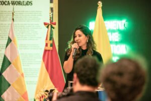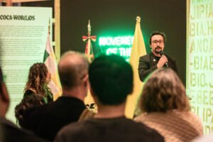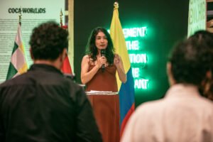 With support from the Permanent Missions of Colombia and Bolivia to the UN, Liana officially opened the exhibition showcasing the work of seven Colombian artists and one Bolivian artist in a large-format display inside UN headquarters. The event catalyzed dialogue between artists and diplomats on coca as a sacred, political, and cultural force.
