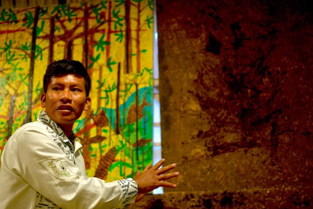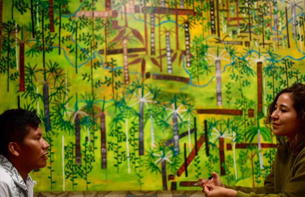 The article emerges from an in-depth interview I conducted with Aimema Úai in October 2025, at his home-studio in Bogotá, just days before his trip to Belém do Pará to participate in the Amazon Biennial and in parallel spaces to COP30. From that conversation, the text explores how his pictorial practice—activated by mambe, by the spoken word, and by pigments drawn from the territory such as wito and dragon’s blood resin—functions as an extension of the maloka, the ceremonial house, school, and spiritual center of the Murui-Muina people.